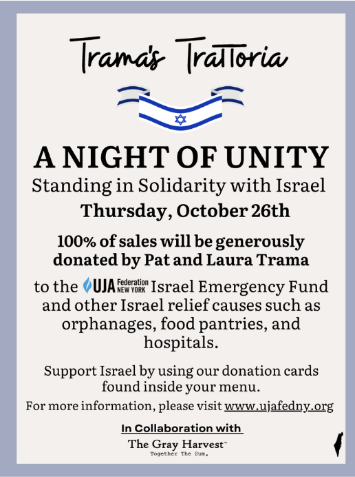 Hosted by Pat and Laura Trama in their Long Branch restaurant, Trama’s Trattoria, this event was focused on unity and solidarity with Israel. 100% of the sales were donated to The United Jewish Federation of New York’s Israel Emergency Fund.