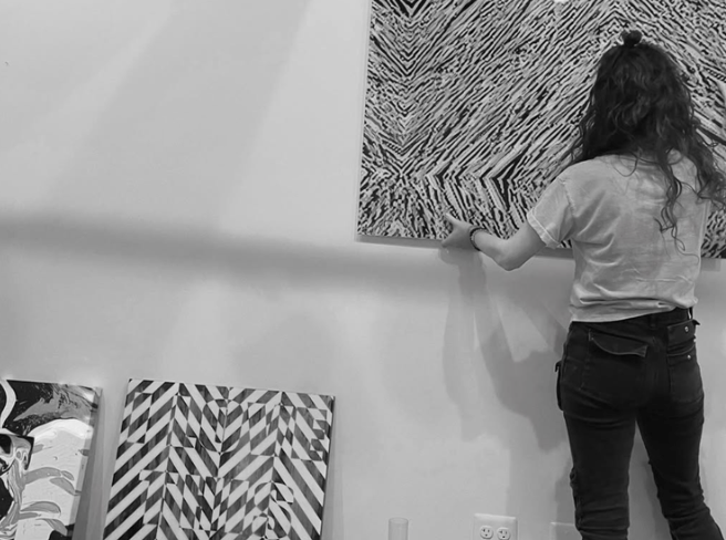 Margalit Romano is a contemporary, self-taught artist based in New Jersey. Her work explores the life of color and how it transforms through different patterns and techniques. At first glance, Margalit’s work is mesmerizing and colorful, however there is much more hidden behind the surface. The linear, and often complex stripe designs are done with straight lines created through an organic process. The paint is dripped down the surface; traditional painting tools are rarely used. This organic painting process creates a very clean visual, that clients love for their spaces.
